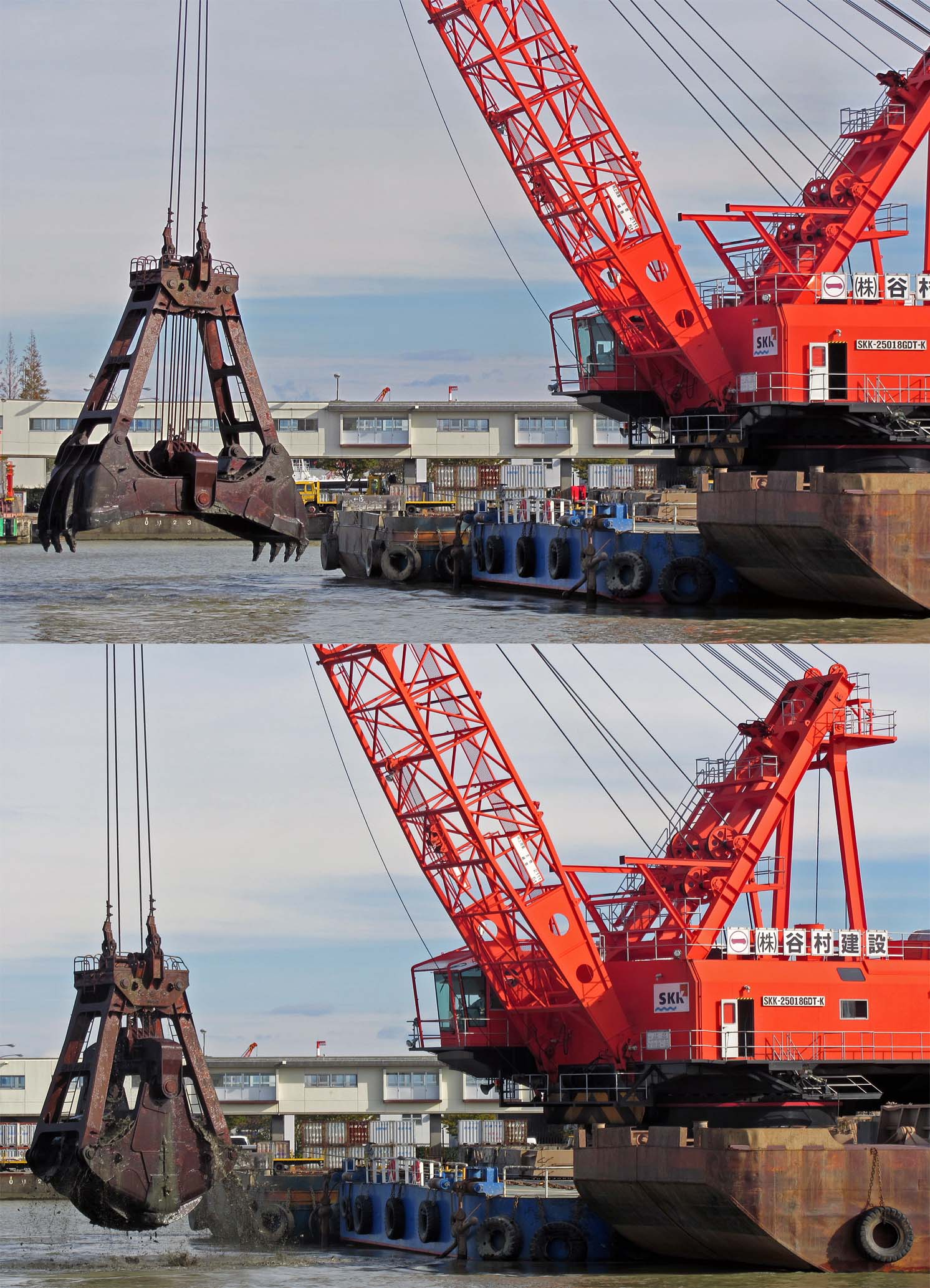 ふと川に目をやると巨大重機が!よく見る光景ですよね。