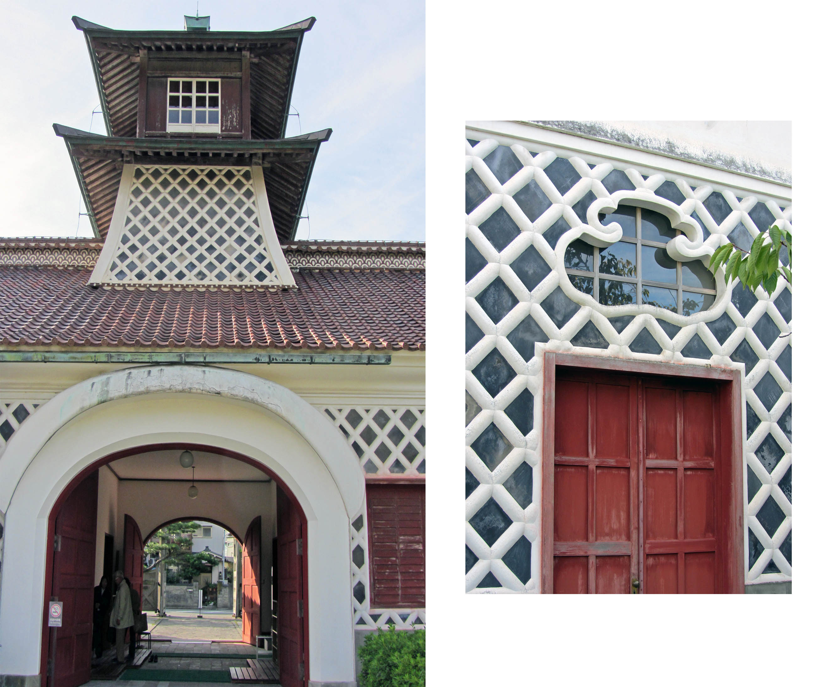 特徴はこの壁。「なまこ壁」です。そして屋根の頭頂部の波模様は「青海波」といい屋根に施すことで火除けの願いが込められています。脇には巾着型の小窓の意匠が。まだまだありますがここまで。